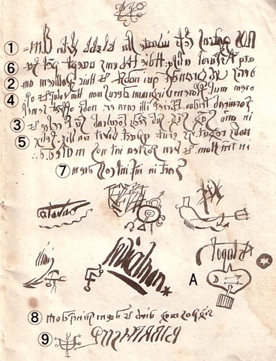 乌尔班契约书以反转后的拉丁语写就,英译版登载于在维基百科上。由于原文较长不宜登载,还请感兴趣的读者移步维基阅读。简而言之,其主要内容是放弃对上帝的信仰,每日 3 次地向恶魔祈祷,并尽可能的做恶事。作为交换,恶魔保证运用恶魔之力给予其 20 年的幸福生活。书于图 1 下半部分那些既不像图画也不像文字的东西被认为是与契约相关的 6 位恶魔的签名[3]。这种契约内容在与恶魔的契约文书中是非常常见的形式,尤其是定有期限这点,同样是《戏剧浮士德》的原型——《浮士德传说》[4] 中的设定。